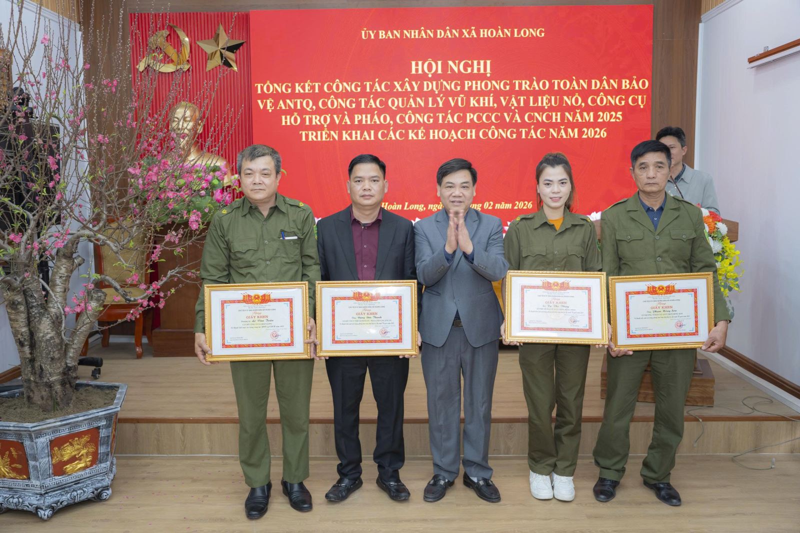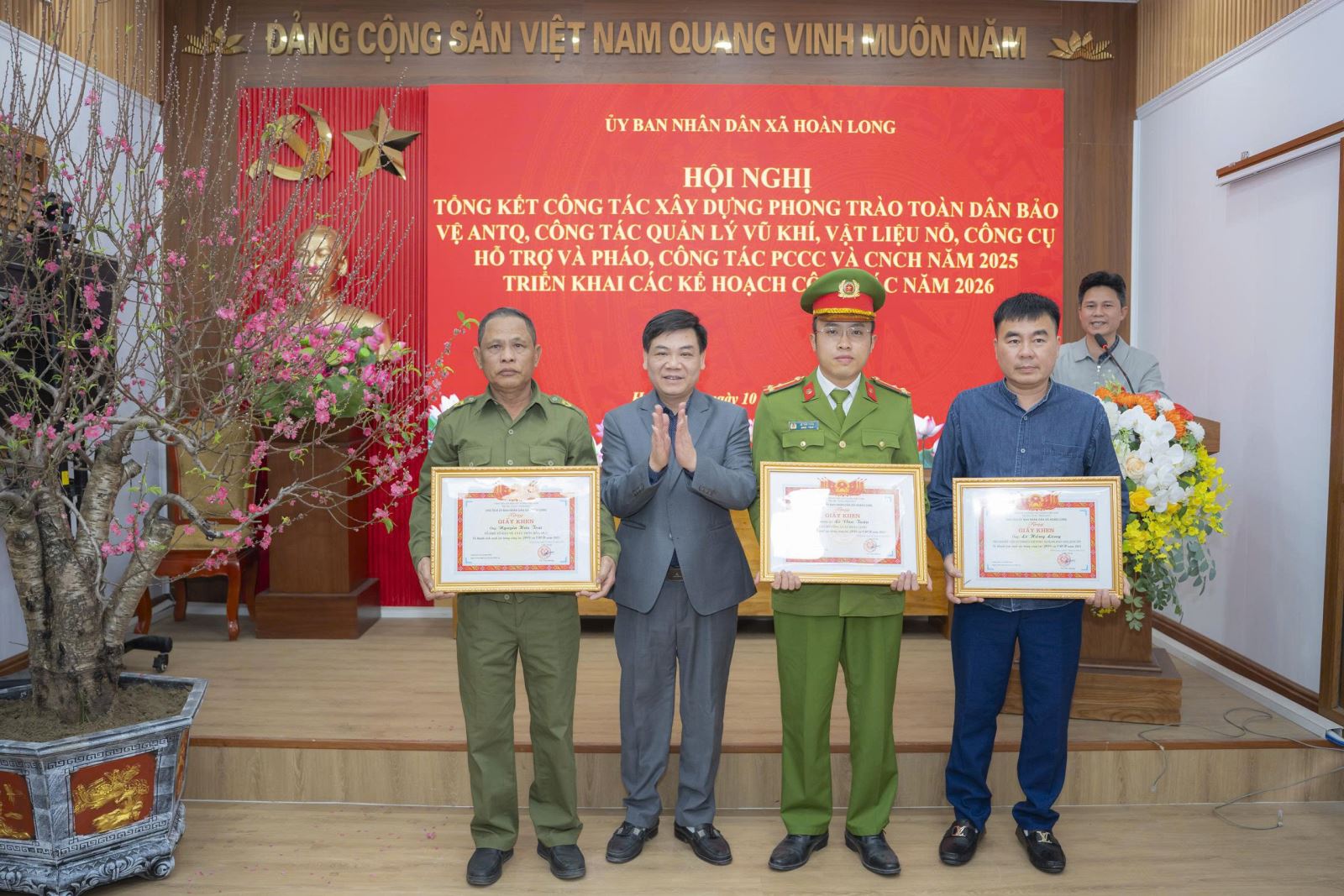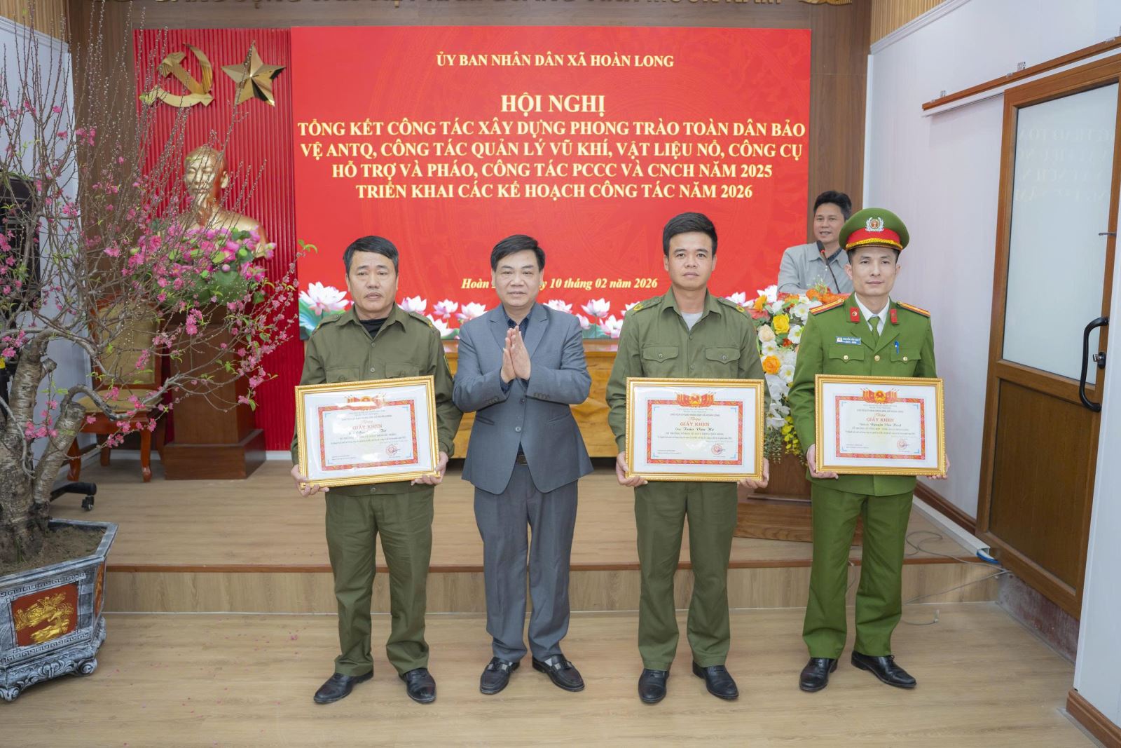 Nhân dịp này, UBND xã Hoàn Long đã khen thưởng các tập thể, cá nhân có thành tích xuất sắc trong phong trào Toàn dân bảo vệ an ninh Tổ quốc; trong công tác quản lý vũ khí, vật liệu nổ, công cụ hỗ trợ và pháo; công tác PCCC và CNCH năm 2025.