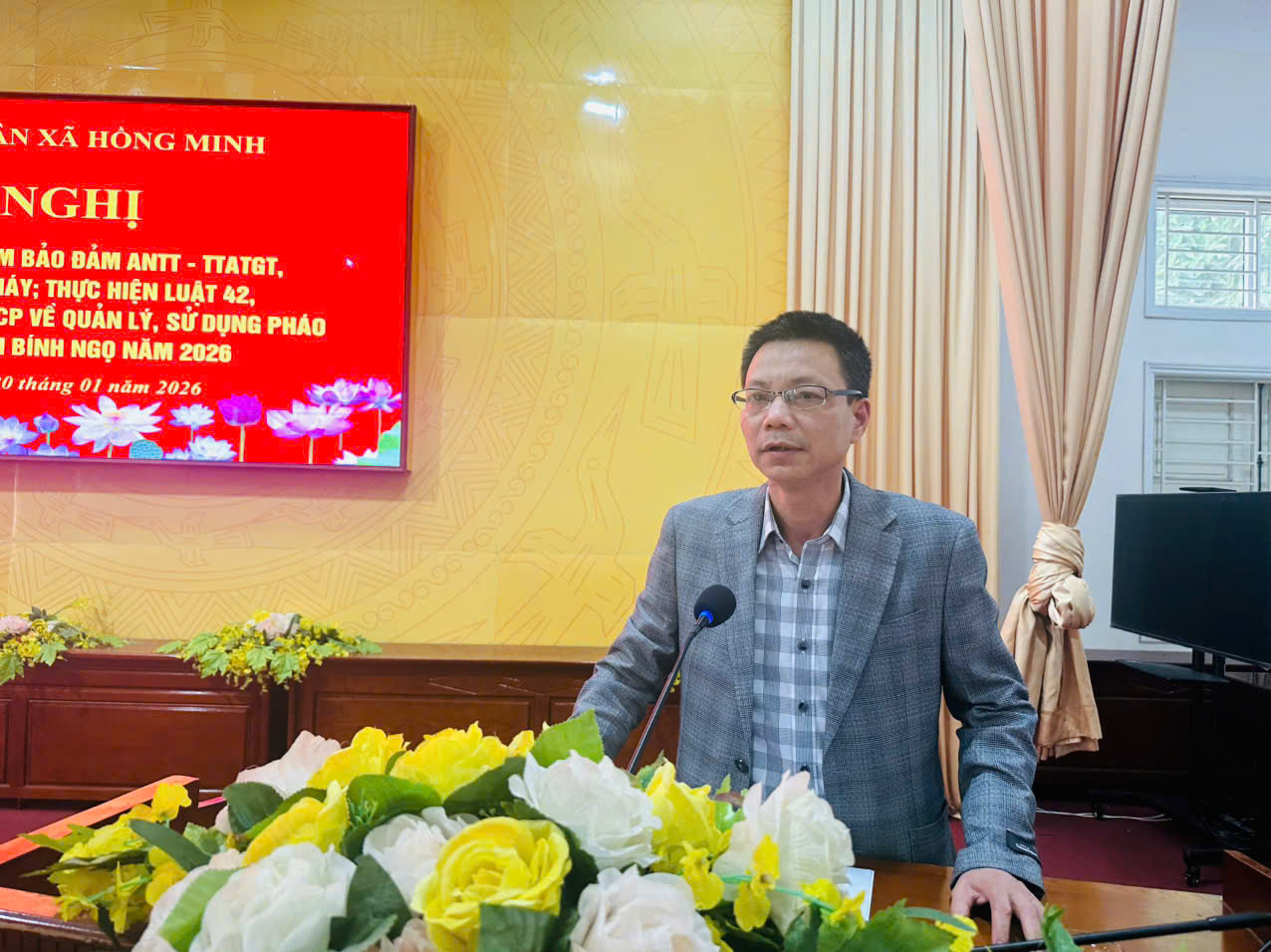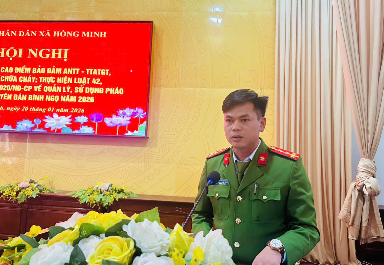 Chiều ngày 20/01/2026, Công an xã Hồng Minh đã tham mưu UBND xã tổ chức Hội nghị triển khai đợt cao điểm bảo đảm an ninh trật tự, trật tự an toàn giao thông, phòng cháy chữa cháy; thực hiện Luật 42/2024/QH15 về Quản lý, sử dụng vũ khí, vật liệu nổ và công cụ hỗ trợ, Nghị định số 137/2020/NĐ-CP về quản lý, sử dụng pháo dịp Tết Nguyên đán Bính Ngọ năm 2026. Dự và chỉ đạo hội nghị có đồng chí Phạm Văn Soi, Phó Bí thư Thường trực Đảng uỷ xã; đồng chí Lưu Quang Phóng, Phó Bí thư, Chủ tịch UBND xã; đồng chí Đại uý Bùi Trung Thành – Trưởng Công an xã và Lãnh đạo các phòng, ban, ngành, các đồng chí Hiệu trưởng các nhà trường, Trạm trưởng Trạm y tế; Các đồng chí Bí thư chi bộ, Trưởng thôn, toàn thể cán bộ, chiến sỹ Công an xã và các lực lượng ANTT tại cơ sở thôn…