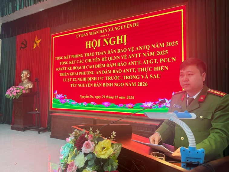 Phát biểu chỉ đạo tại hội nghị, đồng chí Nguyễn Việt Hùng - Phó Bí thư Đảng ủy, Chủ tịch UBND xã ghi nhận, biểu dương những kết quả đạt được của cấp ủy, chính quyền và Nhân dân xã Nguyễn Du trong công tác bảo đảm an ninh, trật tự năm 2025; đồng thời yêu cầu lực lượng Công an xã tiếp tục phát huy vai trò nòng cốt trong đẩy mạnh phong trào toàn dân bảo vệ an ninh Tổ quốc, chủ động phòng ngừa, đấu tranh với các loại tội phạm và vi phạm pháp luật; tập trung triển khai đồng bộ các biện pháp bảo đảm an ninh, trật tự, an toàn giao thông; thực hiện nghiêm các quy định về phòng cháy, chữa cháy, quản lý, sử dụng vũ khí, vật liệu nổ và công cụ hỗ trợ, bảo đảm cho Nhân dân đón Tết Nguyên đán Bính Ngọ năm 2026 an toàn, lành mạnh.