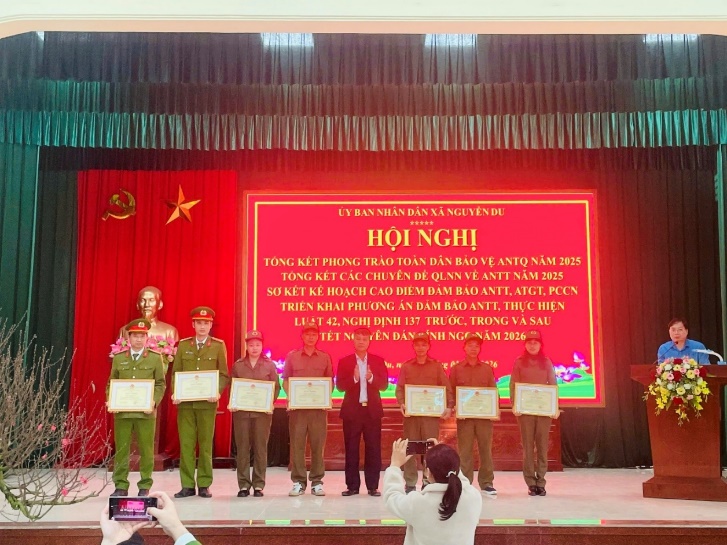Nhân dịp này, UBND xã Nguyễn Du đã biểu dương, khen thưởng các tập thể, cá nhân có thành tích xuất sắc trong phong trào toàn dân bảo vệ an ninh Tổ quốc và công tác bảo đảm an ninh, trật tự năm 2025.