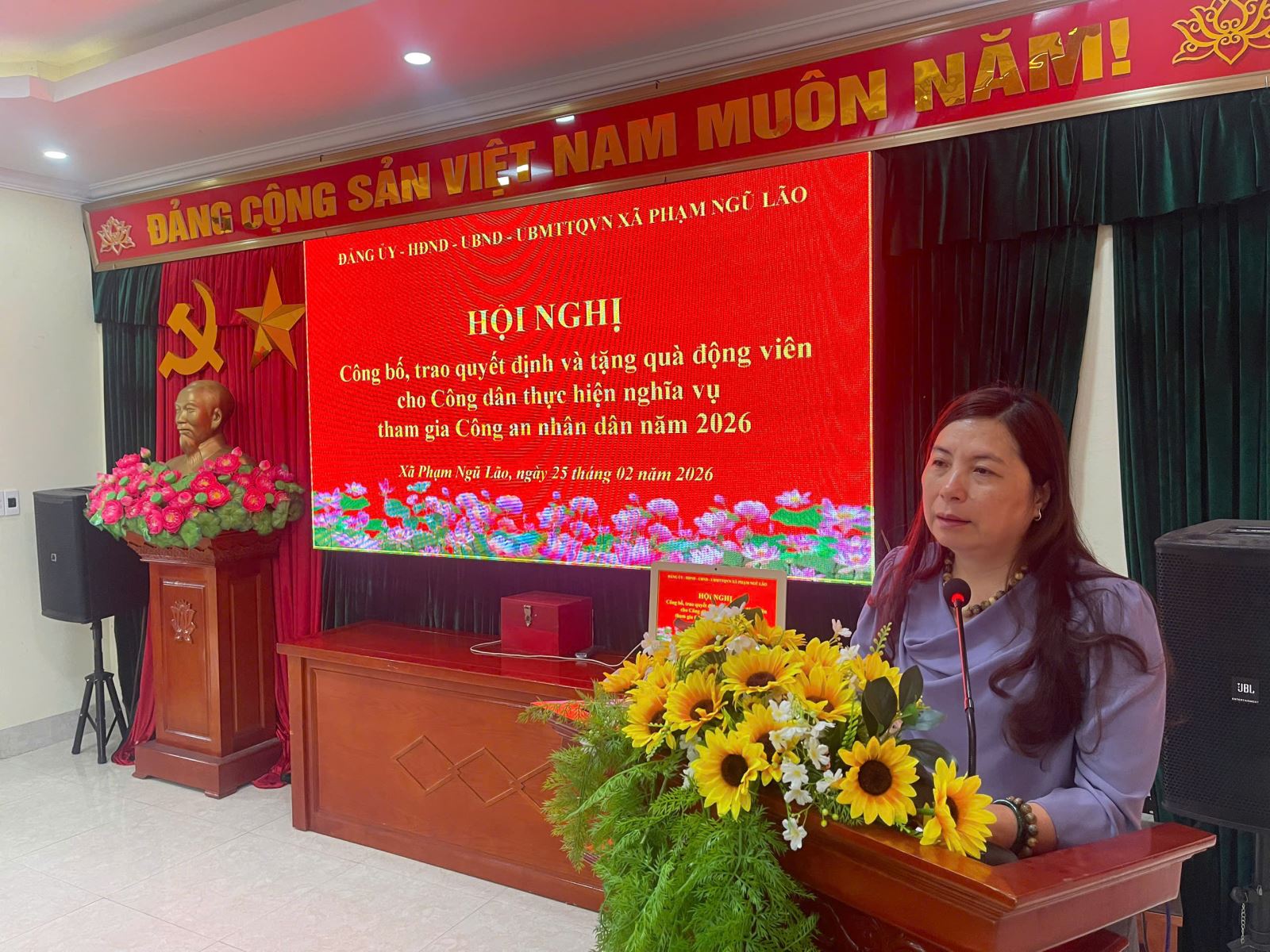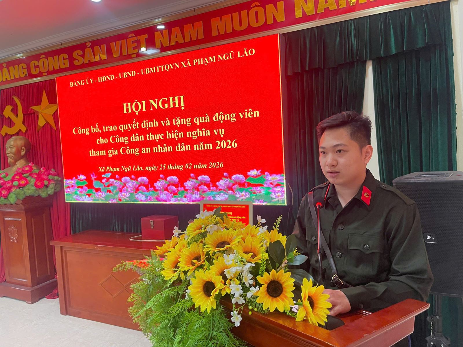 Phát biểu tại hội nghị, đồng chí Bạch Thị Hằng, Phó Bí thư Đảng ủy, Chủ tịch UBND xã Phạm Ngũ Lão chúc mừng các công dân trúng tuyển nghĩa vụ Công an nhân dân, ghi nhận tinh thần xung kích, trách nhiệm của tuổi trẻ địa phương trong sự nghiệp bảo vệ an ninh, trật tự. Đồng chí nhấn mạnh môi trường Công an nhân dân là môi trường kỷ luật, đòi hỏi bản lĩnh, ý chí và tinh thần vượt khó, đồng thời là “trường học lớn” giúp thanh niên rèn luyện, trưởng thành toàn diện. Lãnh đạo địa phương tin tưởng các tân binh sẽ nhanh chóng hòa nhập với môi trường công tác, nỗ lực học tập, rèn luyện, hoàn thành tốt nhiệm vụ được giao, xứng đáng với truyền thống quê hương.