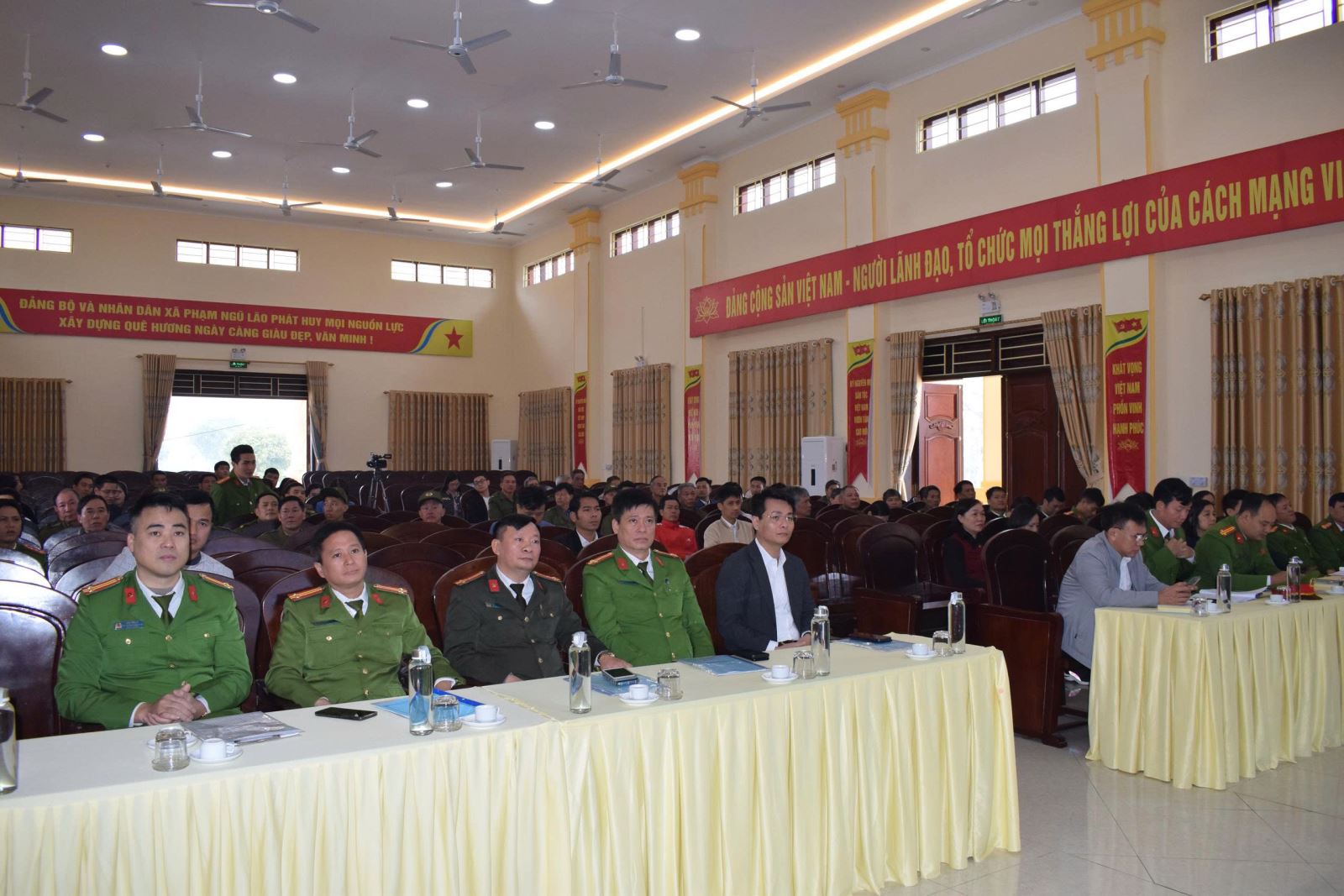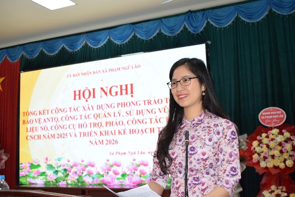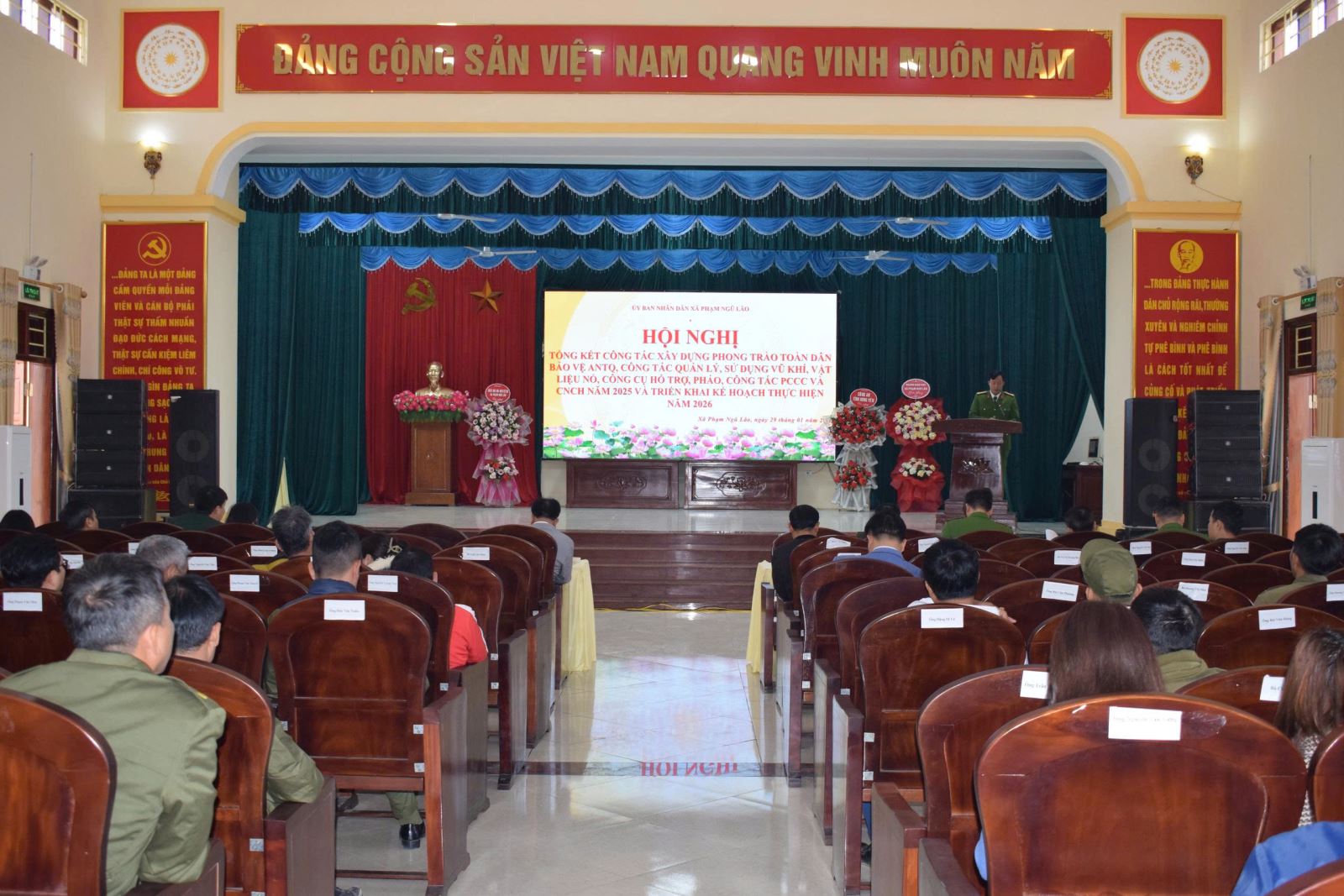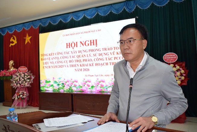 Tại hội nghị, đồng chí Thượng tá Nguyễn Trung Kiên, Bí thư Đảng bộ, Trưởng Công an xã đã trình bày Báo cáo tổng kết phong trào toàn dân bảo vệ an ninh Tổ quốc năm 2025. Đồng chí Đào Văn Tú, Phó Trưởng Công an xã báo cáo tổng hợp kết quả công tác quản lý, sử dụng vũ khí, vật liệu nổ, công cụ hỗ trợ, pháo; công tác phòng cháy, chữa cháy và cứu nạn, cứu hộ trong năm 2025, đồng thời triển khai kế hoạch thực hiện nhiệm vụ năm 2026.