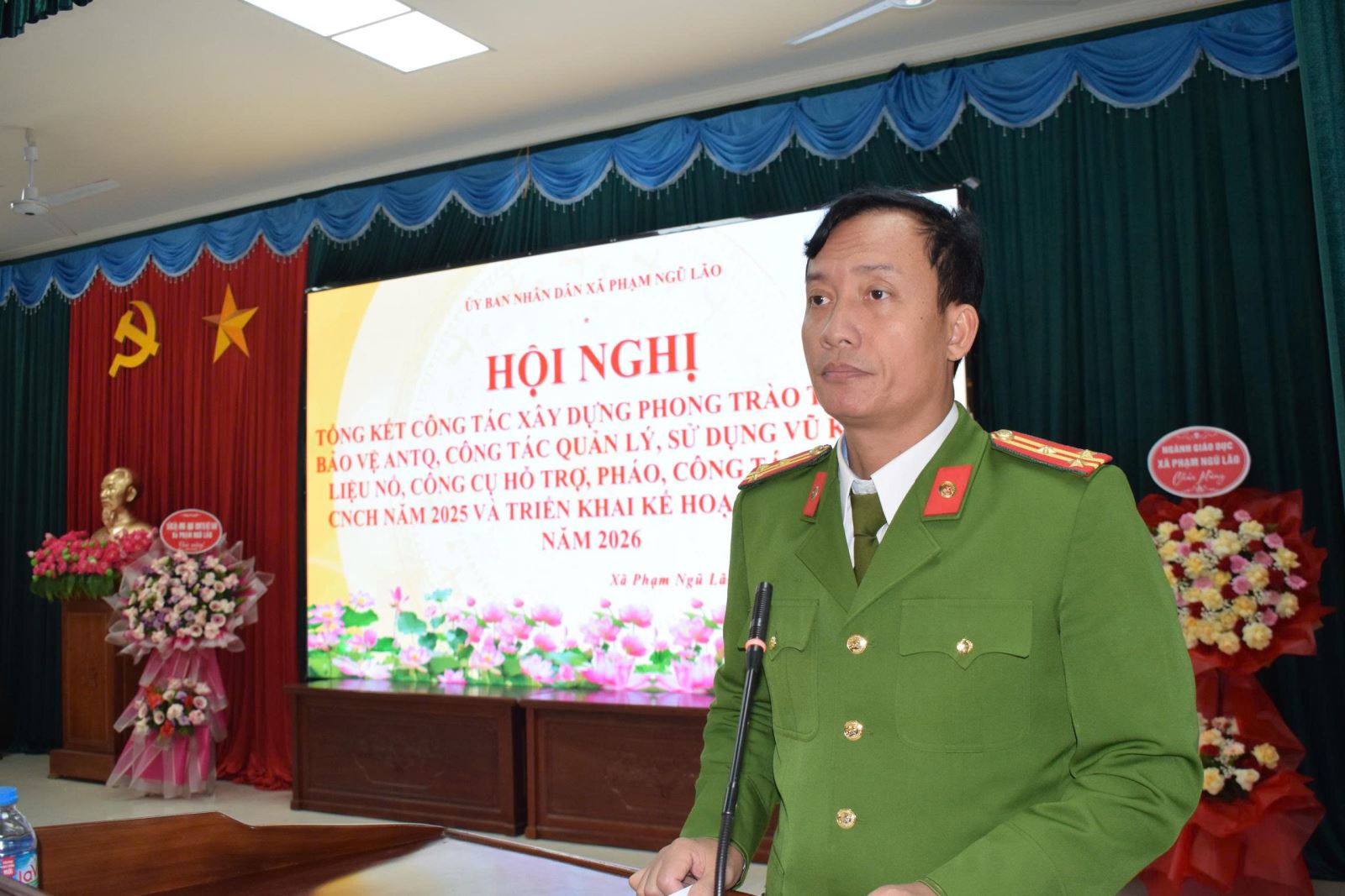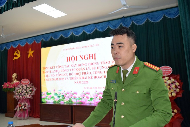 Đồng chí Trung tá Đào Văn Tú, Phó Trưởng Công an xã báo cáo tổng hợp kết quả công tác quản lý, sử dụng vũ khí, vật liệu nổ, công cụ hỗ trợ, pháo; phòng cháy, chữa cháy và cứu nạn, cứu hộ năm 2025; triển khai kế hoạch năm 2026.